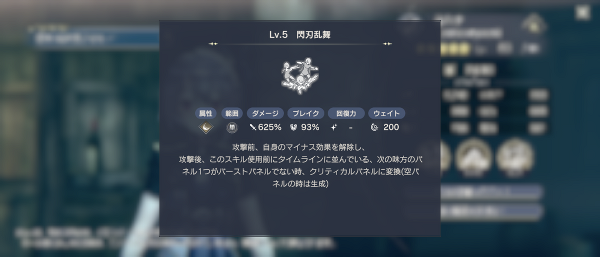 攻撃後、アイテムゲージを10%回復し、味方全員にクリダメ+20%を2回行動終了するまで付与